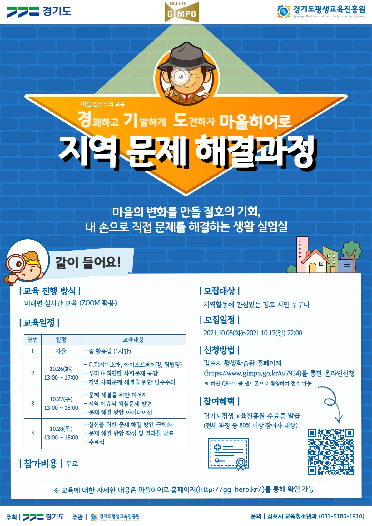 강좌설명 : 김포의 리더 모여라! 김포에서는 어떤 일이 벌어지고 있을까요?지역 내 핵심문제를 발견하고, 능동적 참여 학습기법을 통해 민주적 해결방안을 함께 모색해봐요.---------------> 일상 속 민주주의 실천을 위한 문제해결 실천 역량 강화참여혜택 : 경기도 평생교육진흥원 수료증 발급 가능(수료율 80%이상)